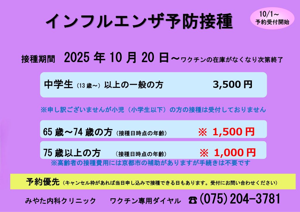 今季は既にインフルエンザの流行が始まっています。お早目にワクチン接種をご検討ください。